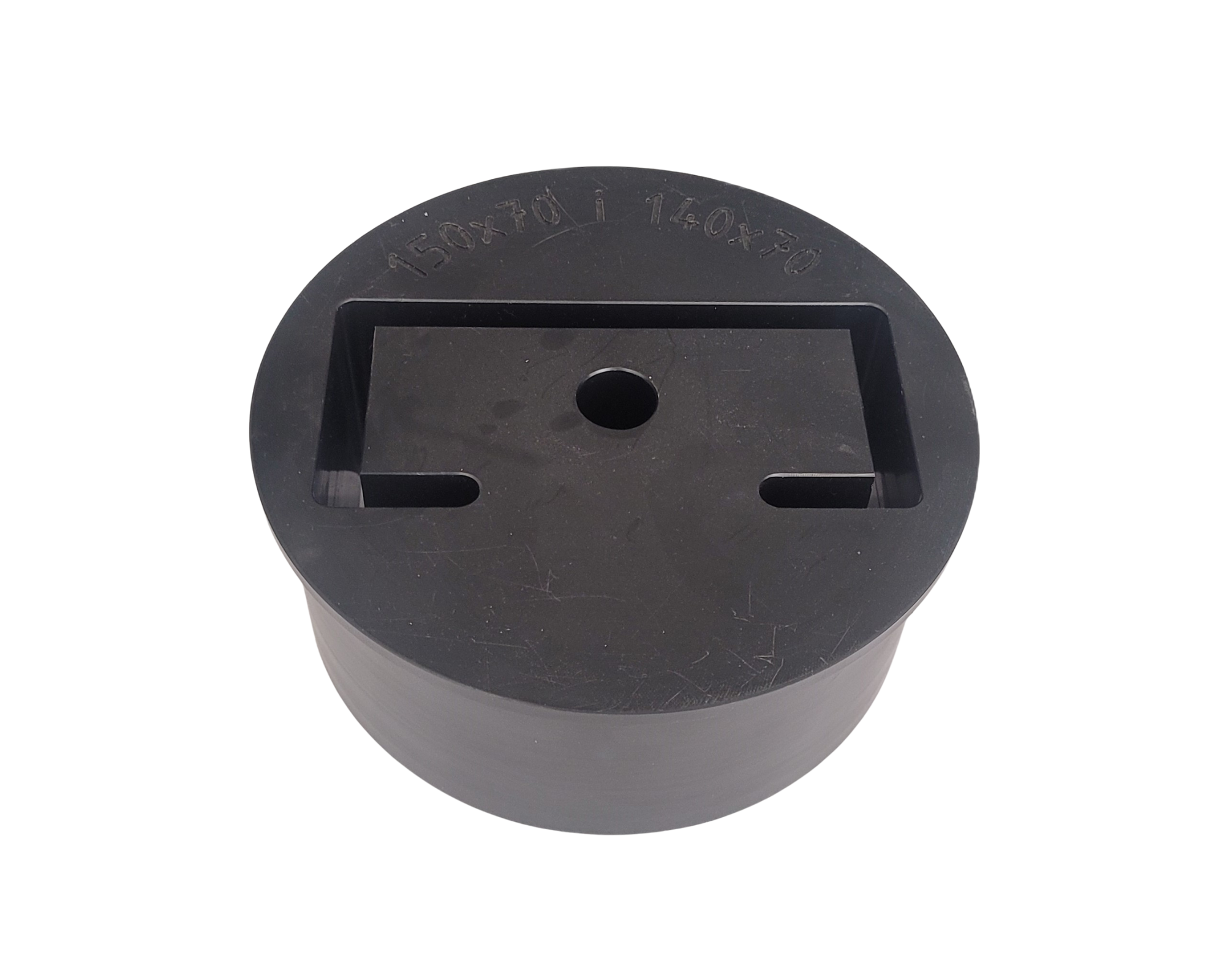 Dwa dedykowane gniazda: dla profilu 150/70 mm i 140/70 mm — jeden adapter obsługuje dwa popularne rozmiary.