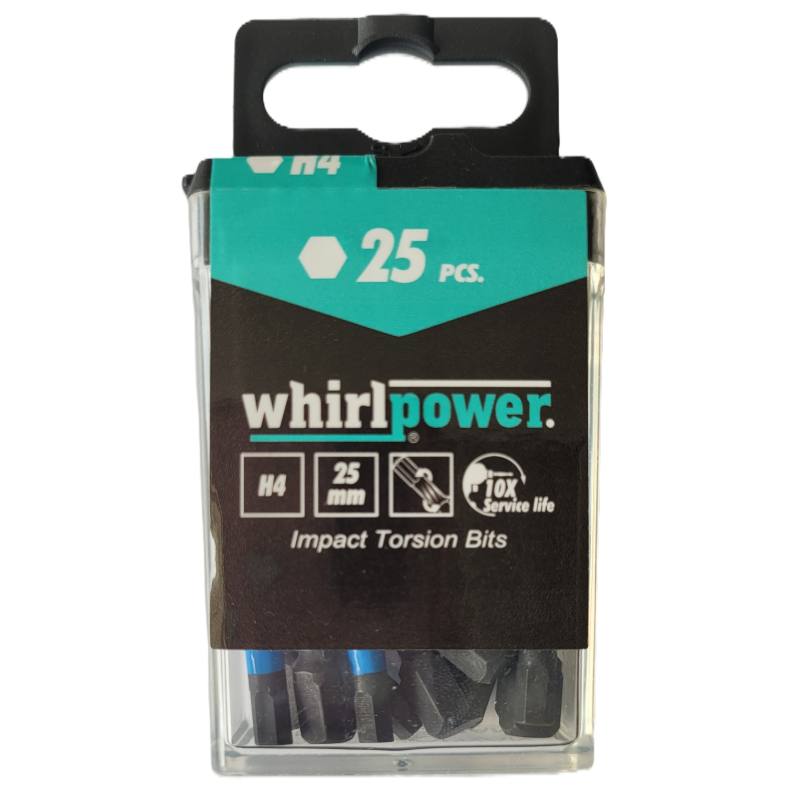 Bity Whirlpower HX4 x 25 mm charakteryzują się wysoką precyzją, twardością wynikającą z użycia stali S2 oraz odpornością na pękanie. Dzięki zgodności z normą DIN, moment obrotowy tych bitów przekracza standardowe wymagania, co zwiększa efektywność wkręcania.